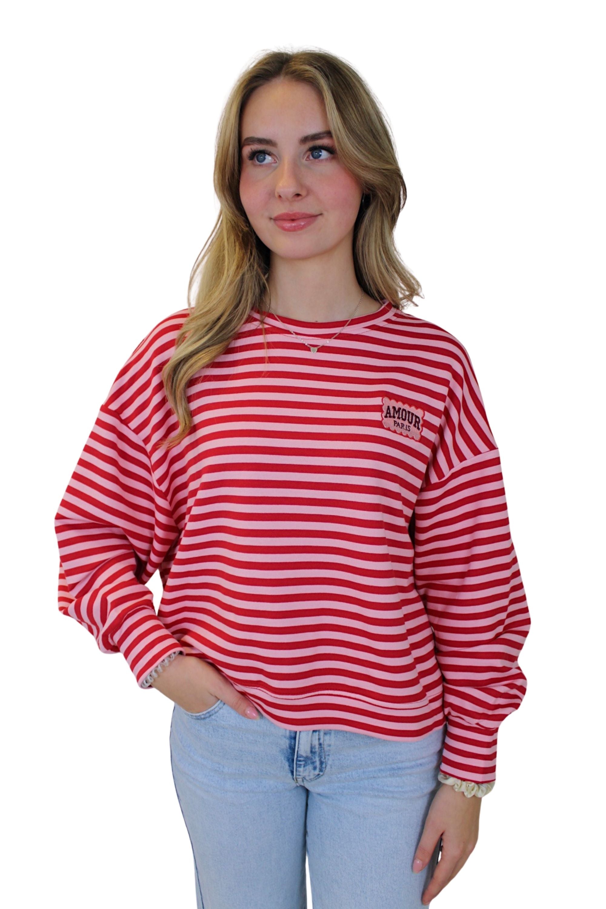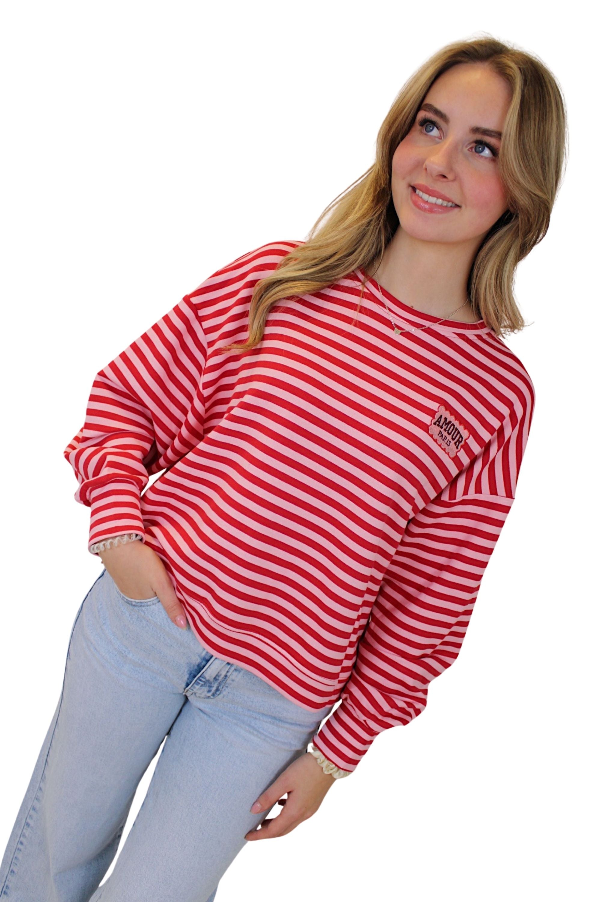 Heerlijke sweater met leuke strepen en tekst "amour". De sweater heeft een fijn, stretchy stofje. De sweater bevat zeer veel... Lees meer