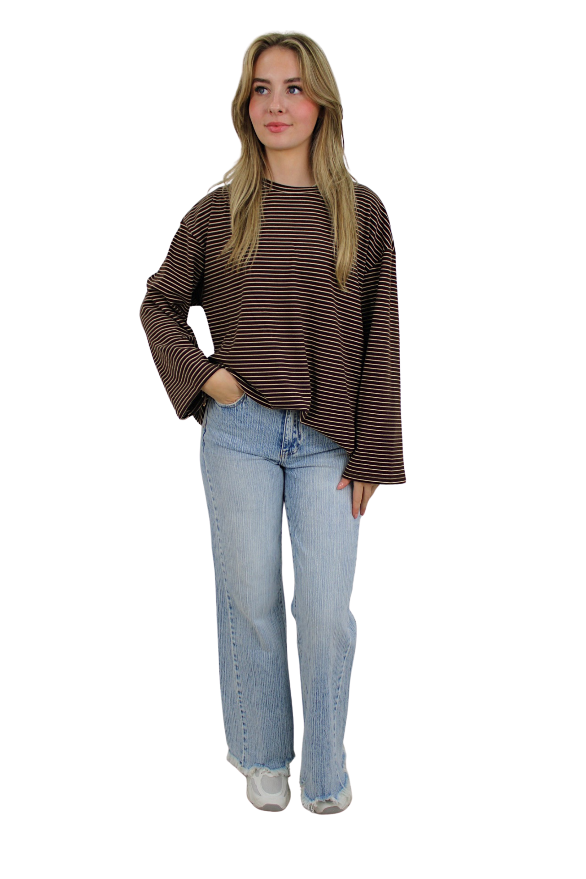 Leuk t-shirts met strepen en flair mouwen. Het t-shirt heeft subtiele uitlopende flair mouwen. Het t-shirt heeft een mega zachte... Lees meer
