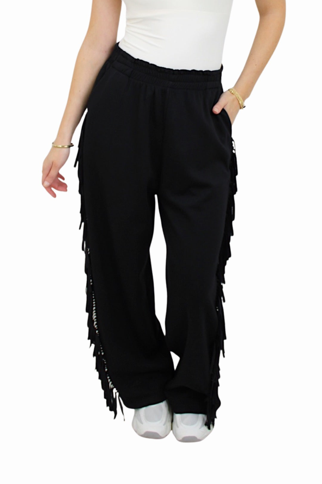 Heerlijke comfy jogger met franjes. De jogger heeft een fijn zacht stretchy stofje. De jogger heeft een wide leg model.... Lees meer