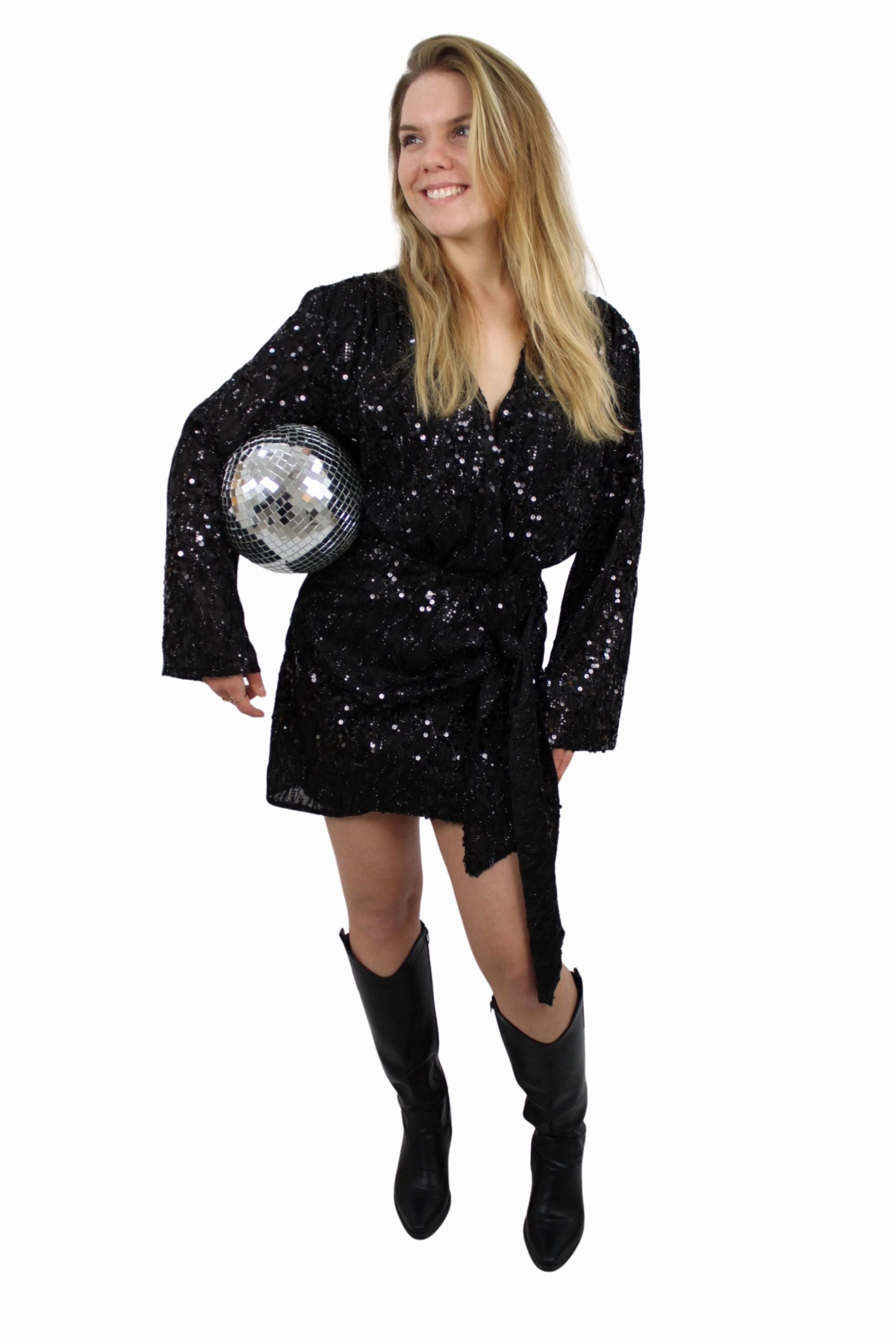 Prachtige glitter jurk met leuke uitlopende mouwen. De glitter jurk heeft pailletten en is volledig gevoerd aan de binnenkant. De... Lees meer