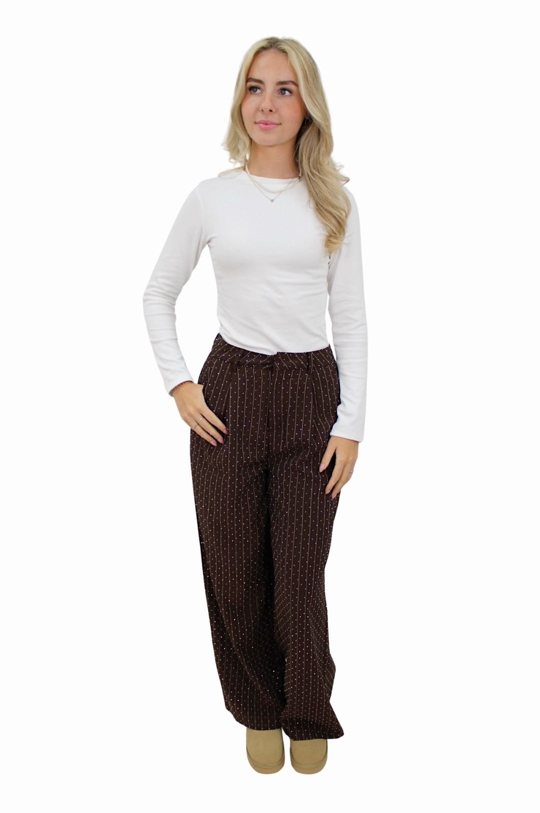 Prachtige glitter pantalon. De pantalon heeft een mooie subtiele glitter. De pantalon is high waist en heeft een mooie wide... Lees meer