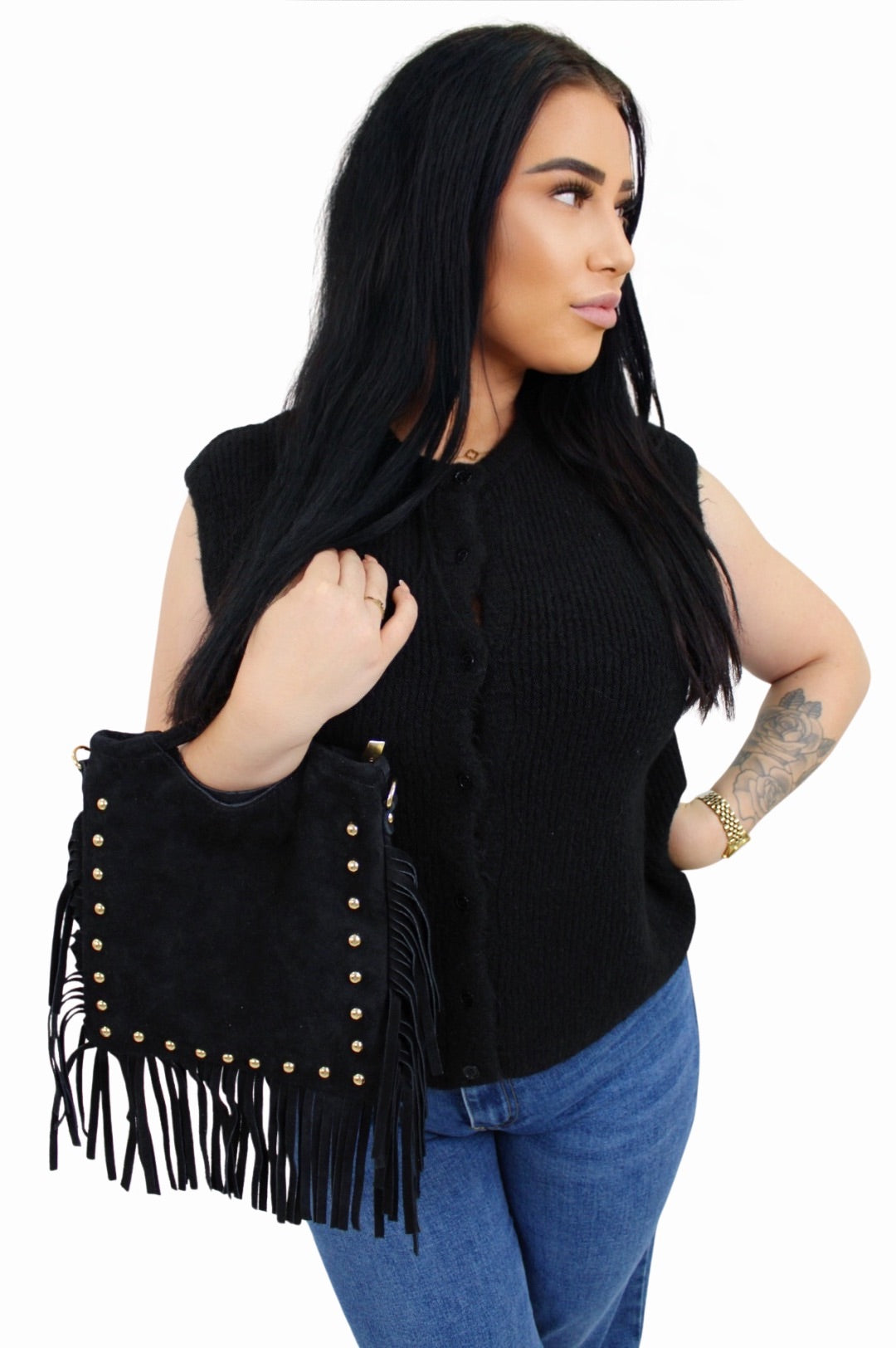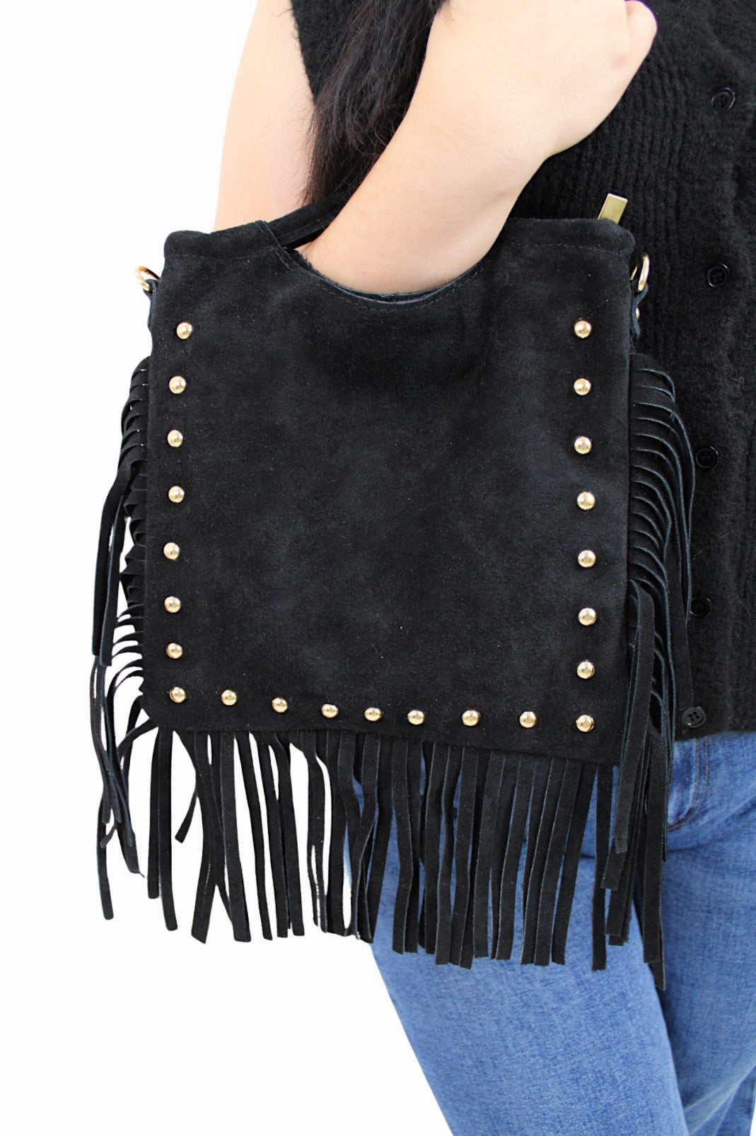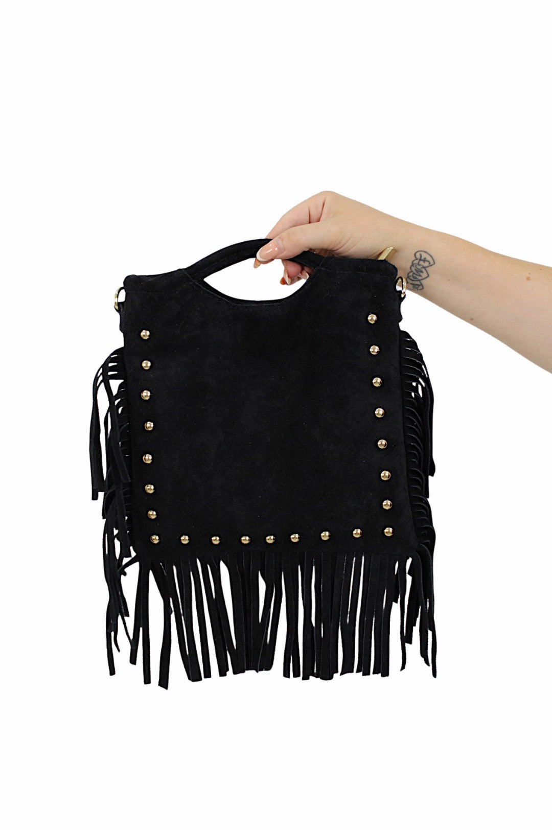 Dit te gekke suede leren franje tasje met studs maakt jou outfift helemaal af! Het tasje heeft leuke studs en... Lees meer